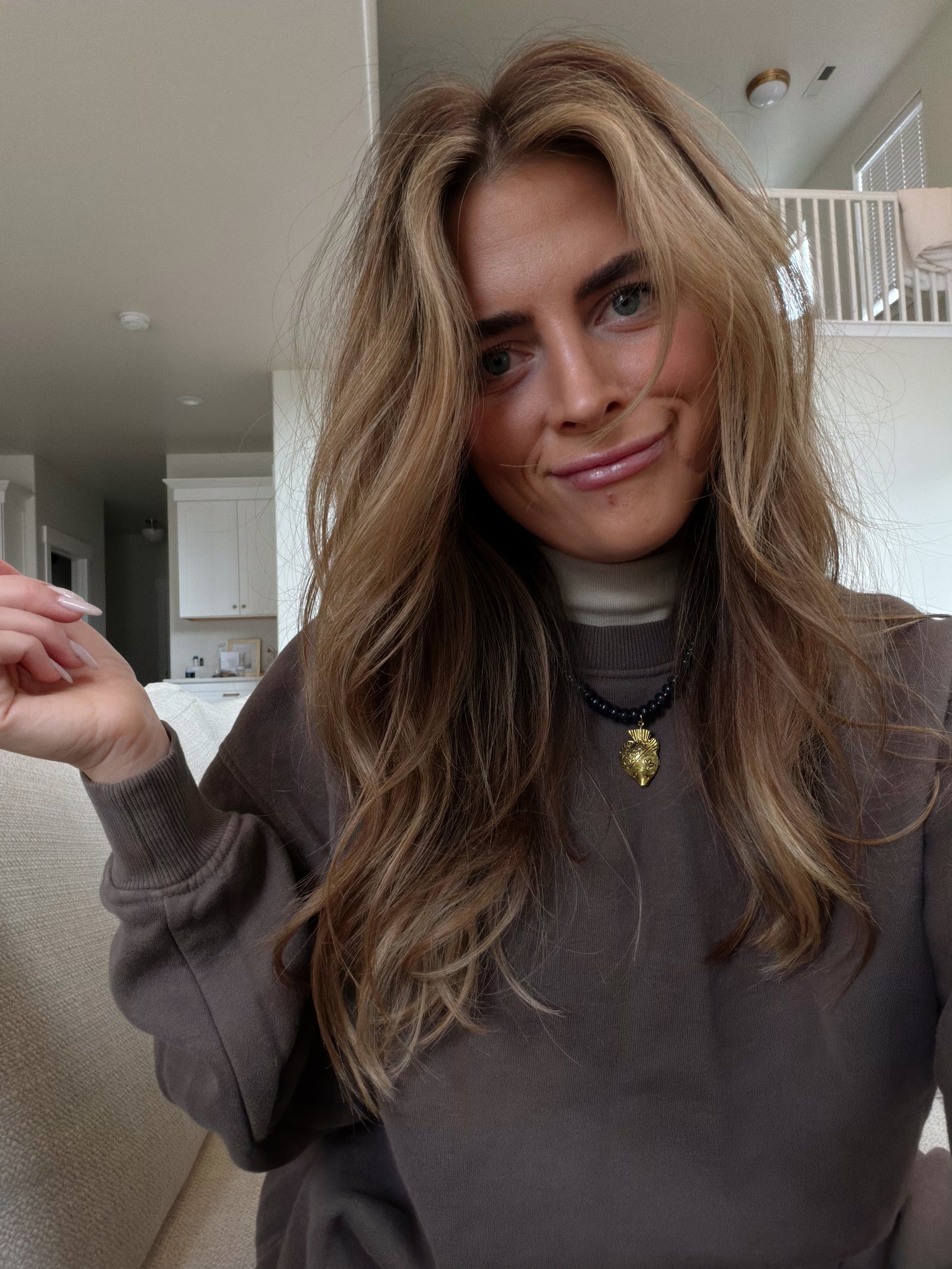 Model 1 wearing length 16” with fish pendant, paired with 17” Gold Chain + Large Baroque Pearl.