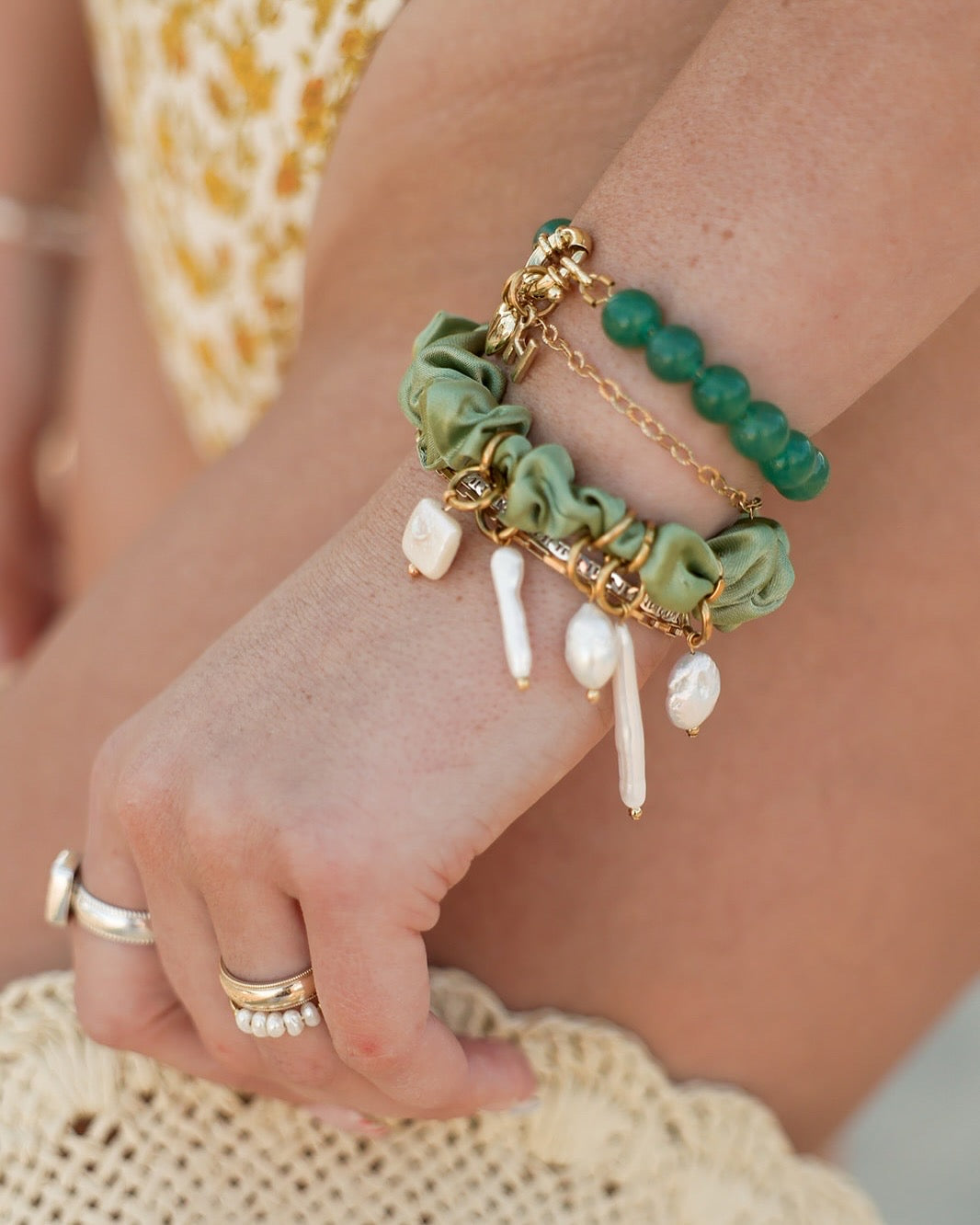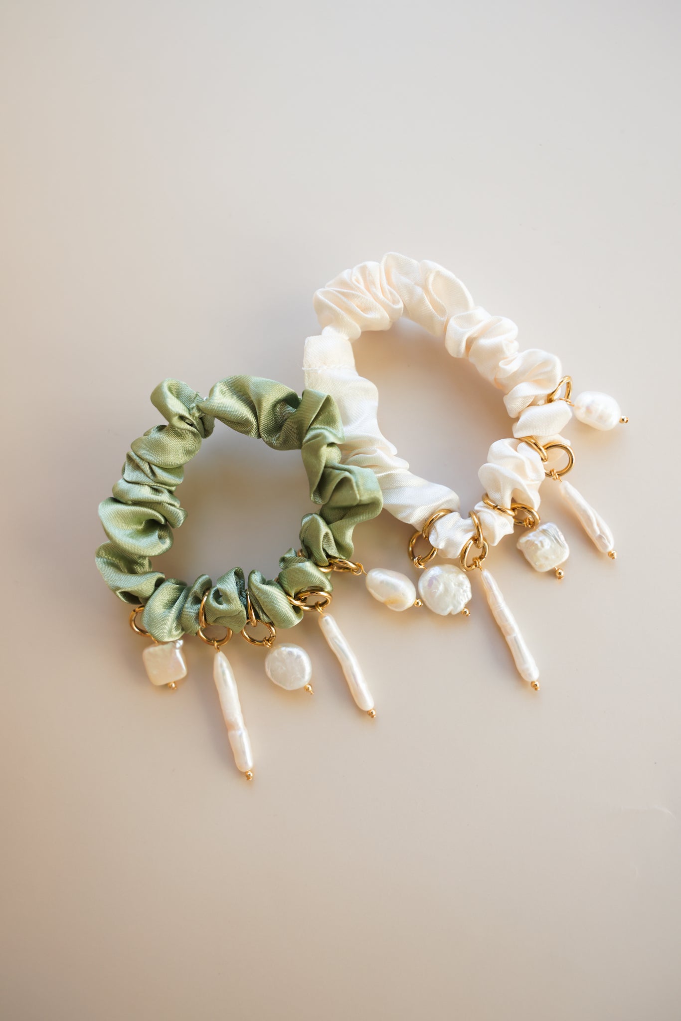 Handcrafted from ivory and olive green scrunchies, 9mm gold filled jump rings, and mixed genuine freshwater pearls.