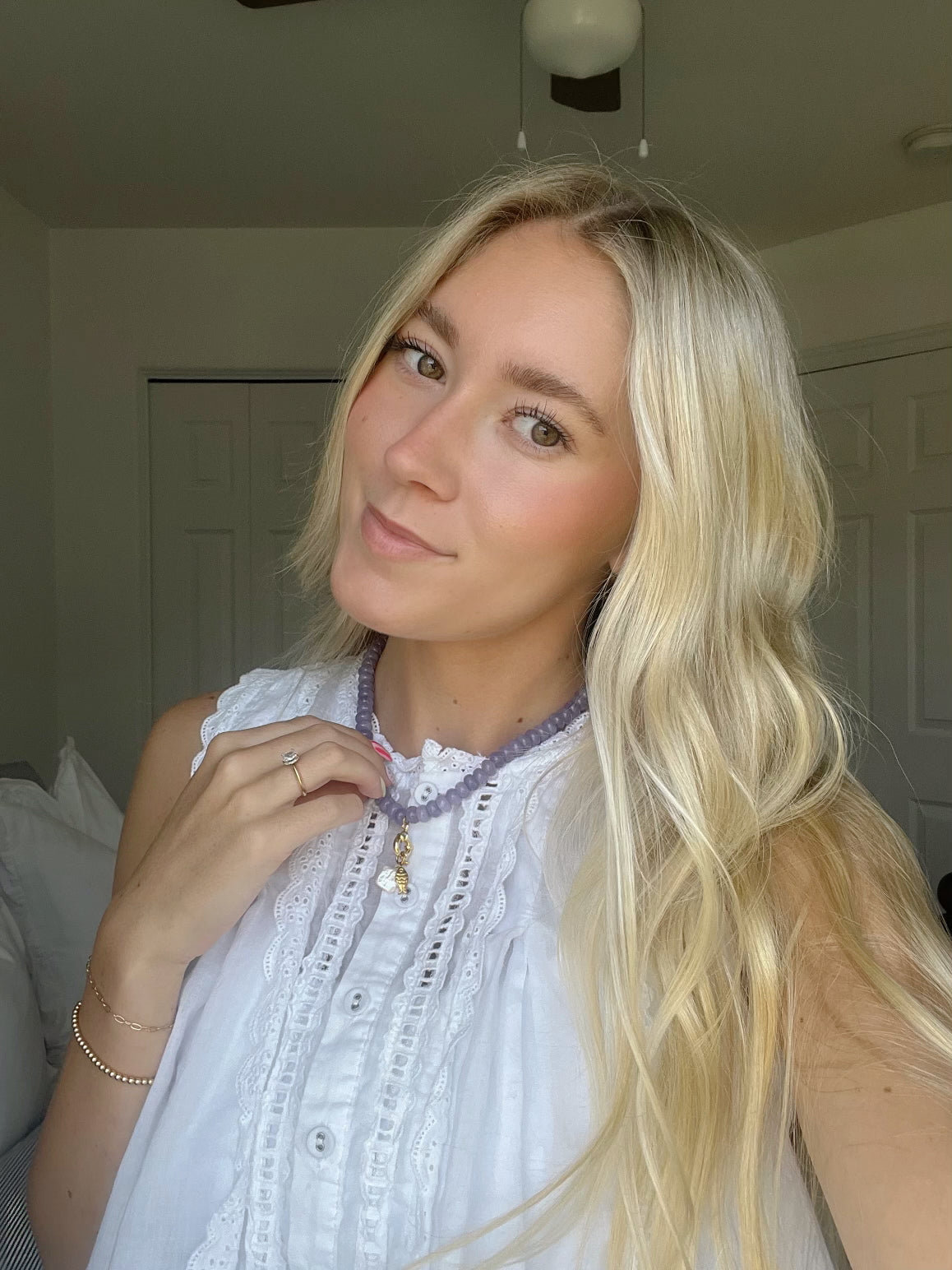 Handcrafted from 5x8mm rondelle purple jade, gold filled 10mm springring closure as pendant, gold filled 6-7mm fish pendant, and 8mm genuine square freshwater pearl pendant (both interchangeable). Also includes a gold filled lobster closure and 2” extender chain.