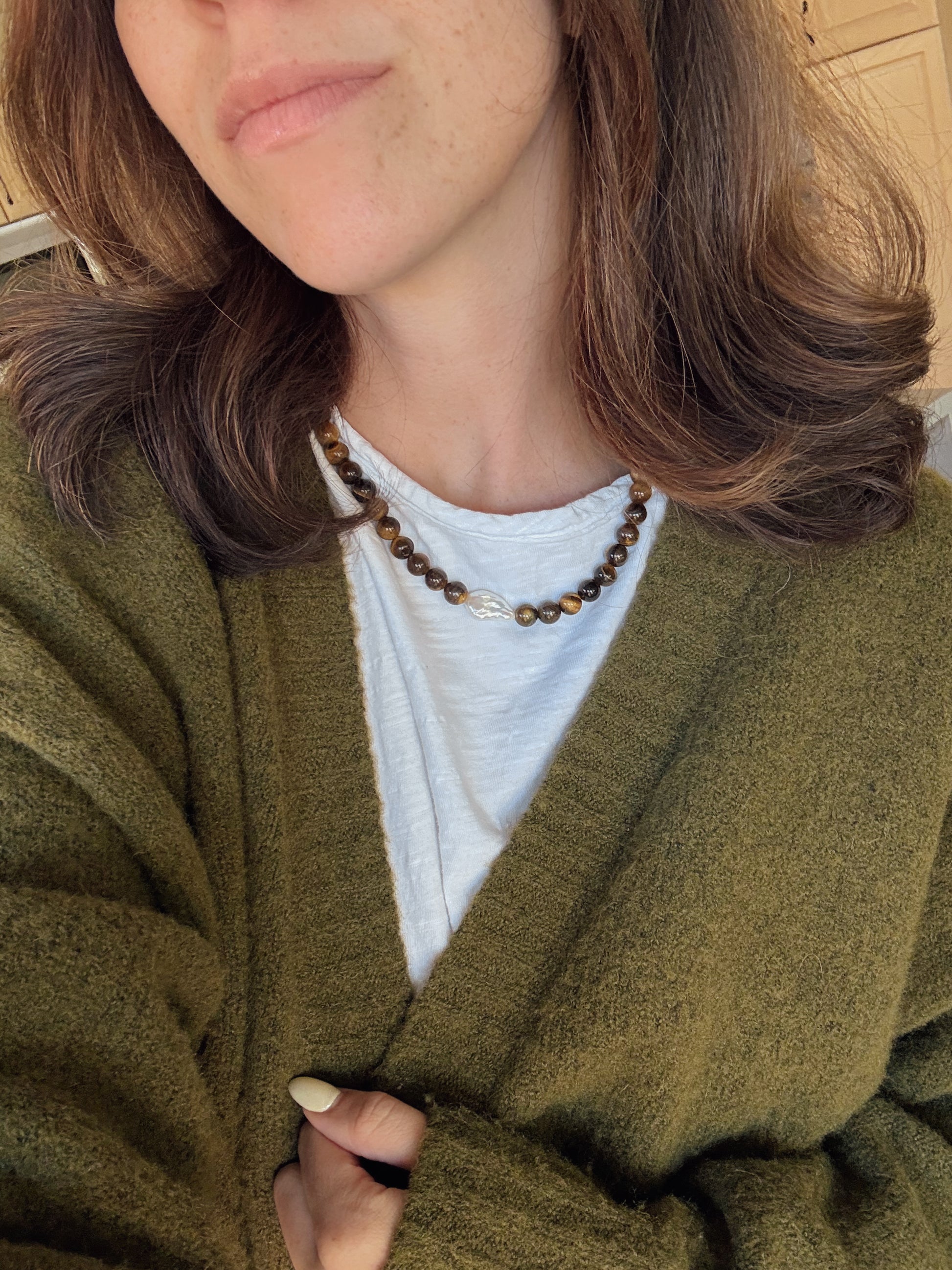 Handcrafted with rich 8mm Tiger's Eye gemstones and finished with a bold baroque pearl centerpiece, this necklace embodies strength and elegance in perfect harmony. Designed with gold-filled hardware, including a secure lobster closure and a 2" extender chain for adjustable length and lasting wear.
