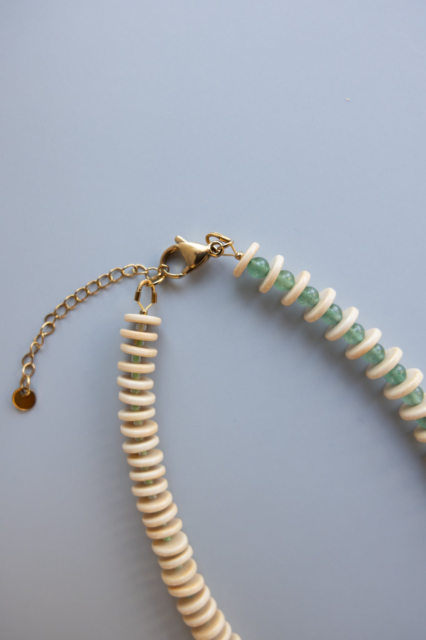 Inspired by sun-washed landscapes and sea-foam tides, The Desert Shore Necklace from our Getaway Collection blends earthy textures with a touch of coastal charm. Designed with heishi agate discs and a mix of 4mm round green aventurine beads on one side and 3mm seafoam green glass beads on the other, it captures the effortless balance of land and sea. A golden-yellow heart pendant adds a warm, radiant finish. Completed with a gold-filled lobster clasp and a 2” extender chain, this piece brings a soft yet striking glow to every getaway look.